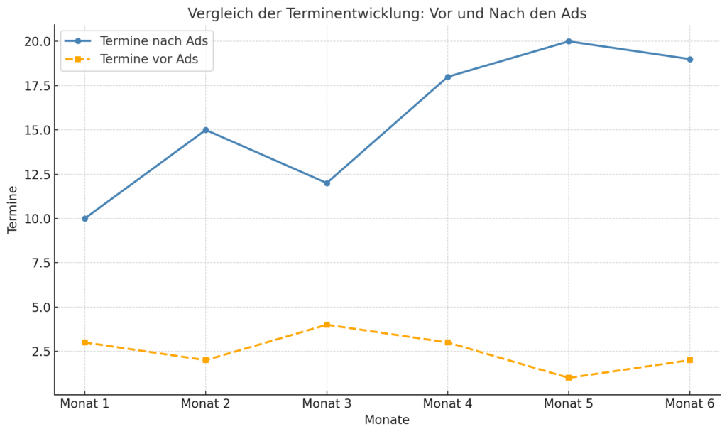 Nach dem Start unserer zielgerichteten Ads-Kampagnen änderte sich das jedoch schnell: Schon im ersten Monat konnte sie 10 neue Termine gewinnen – eine deutliche Steigerung im Vergleich zu vorher. Über die folgenden Monate stabilisierte sich der Zuwachs mit einem Höchststand von 20 Terminen im fünften Monat.